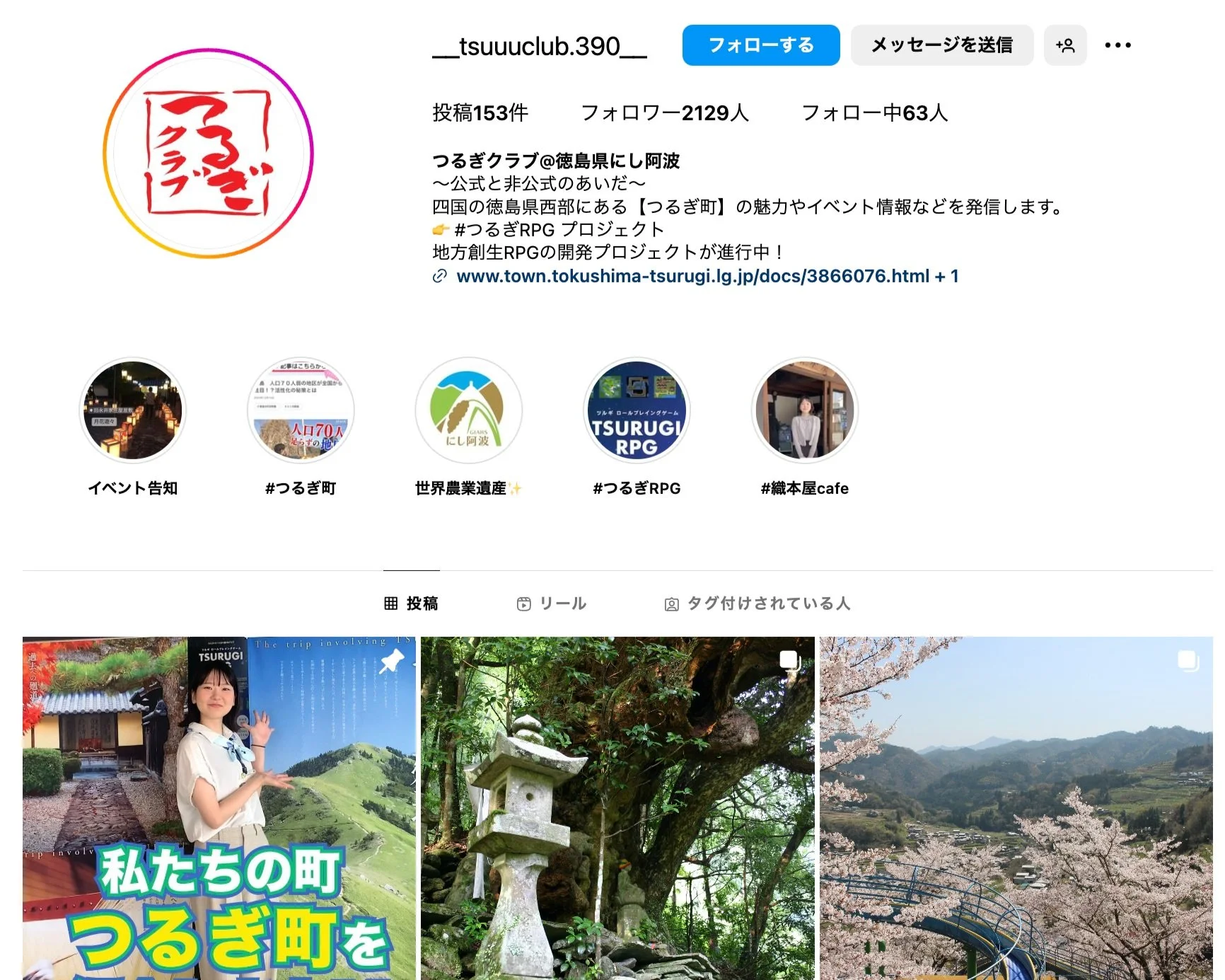 2023年〜、徳島県美馬郡つるぎ町の公式Instagramの運用を担当しています。役場の職員である平さんが出演するショート動画が人気です。